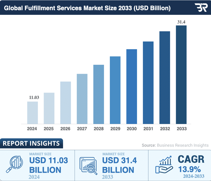 In fact, the global fulfillment services market has grown from $11.03 billion in 2024 to $12.56 billion in 2025. It’s projected to reach $31.4 billion by 2033 at a 13.9% compound annual growth rate (CAGR).
