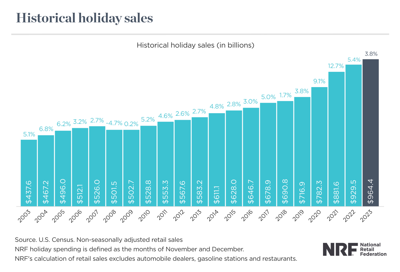 - Holiday retail sales hit $964.4 billion in 2023, up 3.8% from 2022.